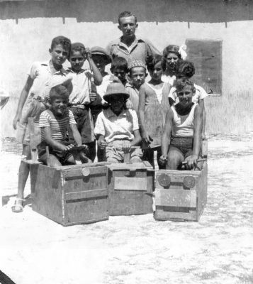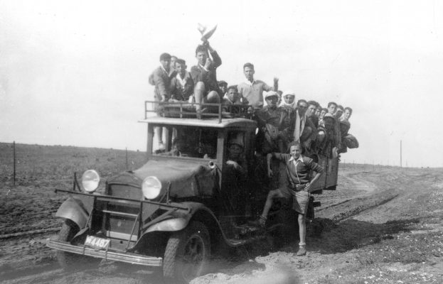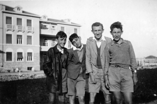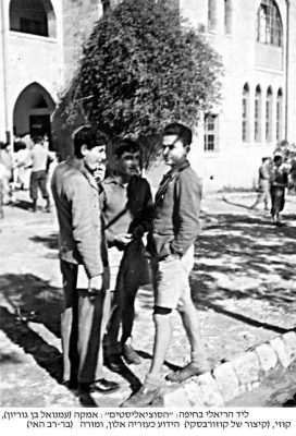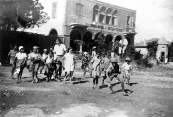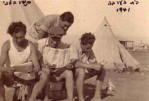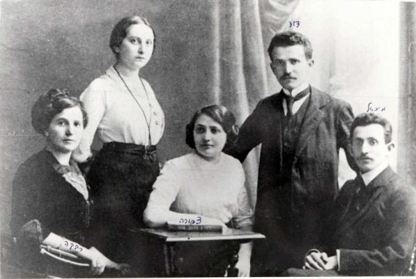 בריאלי בחיפה עמנואל בן גוריון עם עזריה קוזלובסקי אלון והמורה בר הב האי (אביה של נוגה בוטנסקי) 1935