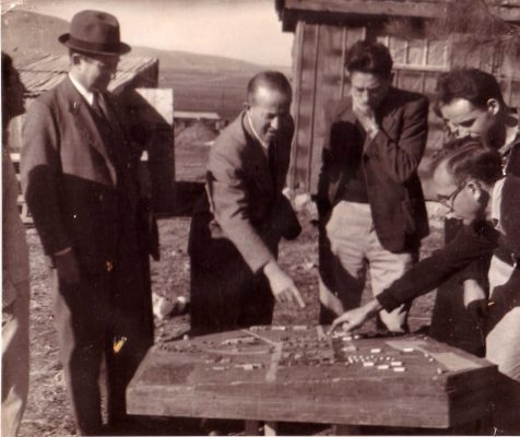 הנריטה סאלד והנס בייט באים לבית השיטה לסקור את התנאים המוצעים לנוער שעתיד להקלט בקיבוץ האורחים מקבלים הסברים מאריה ויוזיק חוגים 1939